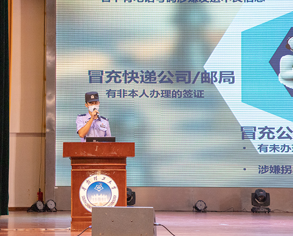 讲座伊始,由王琪警官围绕着“做醒目市民”的主题进行安全教育普及。为了进一步增强同学们的防骗意识,王琪警官通过讲解不同的诈骗冒充类型案例来警醒大家,将诈骗冒充的目的一步步地拆解,将诈骗灌溉的理念一点点地破解,并重点强调同学们应不断提升自身的监管理财能力,切记远离“校园贷”的深圈。在安全教育的末尾,王琪警官给予同学们一本“防骗宝典”,牢记不轻信不转账,不透露个人信息。