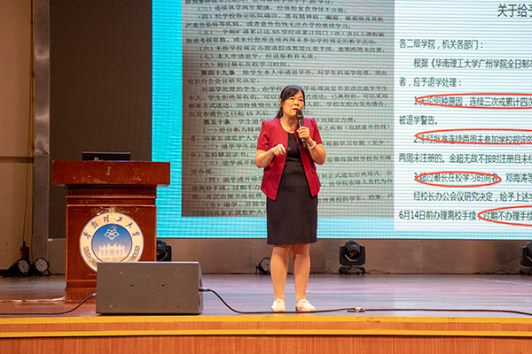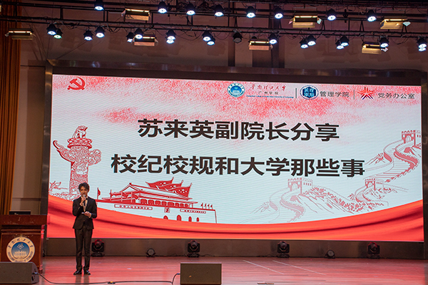 接着,讲座的第二部分由苏来英副院长为同学们讲述“校纪校规那些事”,开场苏院长表示管理学院秉持着“培养好的老师,造就好的老师”的理念,希望同学们通过自律认真规划大学生活。然后苏院长运用实际发生的案例为基础阐明了遵守校纪校规的重要性,同时强调要重视学生手册的考试,通过考试让同学们对学校的规章制度有进一步的认识,从而更好地度过丰富多彩的校园生活,养成德智体美多面发展的品格。此外她也详细地讲解到同学们应重点关注的学籍管理、考场纪律、奖学金及纪律处分,并希望新生认真遵守校纪校规,不要抱存侥幸心理。