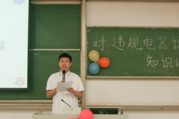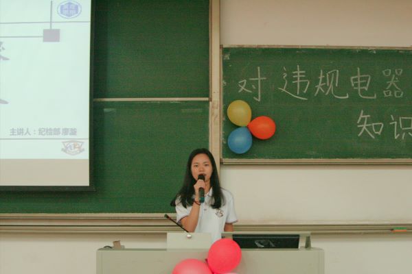 大会伊始,管理学院学生自律委员会先是对违规电器说“不”的海报大赛获奖选手进行颁奖以及鼓励。接着纪检部部长廖漩对违规电器的知识进行了普及和补充,并从广义上解释了违规电器是指大功率电器,使用不当时会危及我们的生命。她认为学校非常注重违规电器的检查,说明违规电器对我们人生安全的危害性很高。她通过播放新闻分别从学生个人层面和学校层面提出了建议:“第一,学生应该杜绝使用大功率电器,多了解用电方面的安全知识,做到正常用电、安全用电。第二,学校的社团组织要加强监督,不定期进行相关检查。第三,学校应该多关注学生的用电需求,并做出相应的措施。”最后,她提倡大家对违规电器说“不”,加强防范意识。