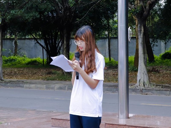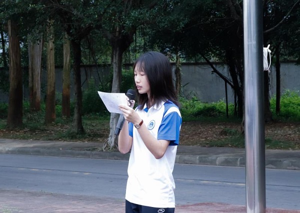 仪式之后,主持人发表致辞。随后来自2016级工商管理学专业一班支部的劳哥琪姐队、2017级工商管理专业二班支部的李平同学及2018级市场营销专业一班支部的华广追梦人队,依次做以“华梦实现,路上有我”为主题的国旗下讲话。