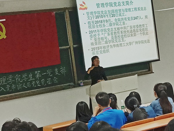 邓老师首先向我院2018级入党申请人介绍了管理学院党总支的发展情况、组织结构图和党总支委员及其职责。其次,她还介绍了与会申请人所属的党支部——管理学院学生第一党支部,作为一股优秀的支部力量,学生第一党支部曾获多项荣誉,并曾成功举办过多次活动,比如“‘关爱生命,远离疾病’党建主题实践活动”、“‘学风建设’主题比赛”、“两会热点大讨论”等。