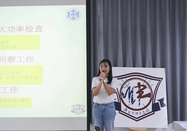 最后,学生自律委员会副主席林境同学进行总结发言。她表示身为纪律委员应以身作则,加强自身纪律起到模范带头作用,同时要“坚守底线”协助纪检部完成班级学风建设考勤工作,加强班级的规范建设,为良好班风、学风养成作出贡献。