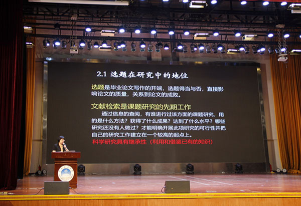 接着,杨华向大家讲解了毕业论文写作要求及文献检索。她着重强调毕业论文的重要性,毕业论文是学生在毕业前进行的总结性、研究性学习阶段,是学生学习的深化和升华过程,毕业论文的质量反映了学生在校期间的学习质量,毕业论文选题要注意的三大原则:科学性原则、创新性原则、实用性原则。对于检索文献,要一次次地检索来逐步接近课题资料。同时,她提醒同学们要趁早准备论文,也祝同学们能顺利完成论文,为大学生活画上圆满的句号。