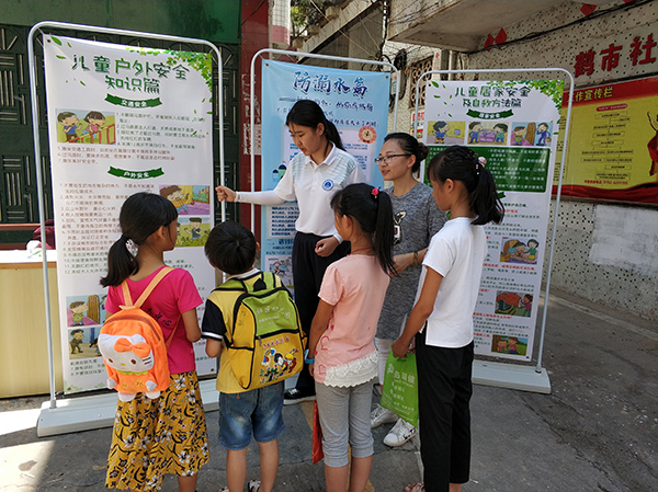 团队在各地人流大的场所设立了安全知识定点摆摊,就团队编撰的儿童安全教育展板对过往家长、儿童进行安全知识宣传和案例分析教育。与此同时,团队成员每三人组成一分队前往各镇各村,进村入户到当地人家中,开展儿童安全知识的调研、普及、宣传和教育工作,并在龙川县鹤市镇人民政府一楼会议厅举行儿童安全知识问答及安全宣誓会。