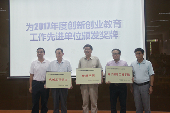 为肯定我校各教育单位在创新创业教育工作中付出的努力,鼓励各教育单位再创佳绩,教务处处长陈锦昌宣读了 “华南理工大学广州学院2017年度创新创业教育工作先进单位”表彰决定,决定授予机械工程学院、电子信息工程学院、管理学院为本年度“创新创业教育工作先进单位”称号,并予以颁发奖牌。