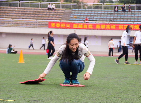 “漂洋过海”则是对体力的考验。参赛队员踩着泡沫垫地前行,各组比赛战术风格迥异,有大步迈进的豪放派,也有小步跳跃的碎步派,他们钻研着各类步法,寻求最快的速度抵达目的地。每个参加完该项目的老师都不禁要喘喘气才能平息内心,让大家体验一把运动的累与欢乐。