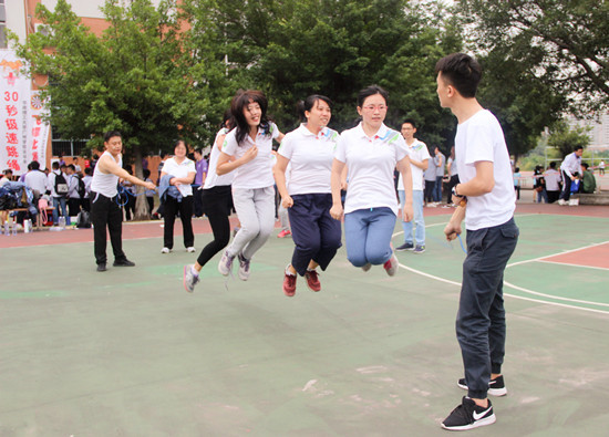 第二轮比赛四个项目分别为“运球帷幄”“六人七足”“趣味跳绳”以及“过长龙”。 “运球帷幄”中,老师们手握羽毛球拍托着网球在操场一列雪糕筒障碍中蛇形穿梭。有身手矫健稳稳地把球控制在球拍上完成顺利交接的,也有不慎把球掉到地上而影响进度的,竞争激烈; “六人七足” 考验着整个团队的合作,各组参赛者的脚两两相绑,六人默契十足,共同喊着“一二一二”, 互相搀扶一同前进,激起场上一片喝彩;“趣味跳绳”这个项目同样也需要默契感,两名参赛者在甩绳子,余下四名参赛者在里面跳绳,需要团队里每一个人的默契度;“过长龙”项目则充满趣味性,呼啦圈在老师们的身上有序传递,一起一落的身影倒是让人看出了几分长龙的意味。每一个项目不仅要求技术,还要有战术,因此,在比赛之前,老师们都会抓紧时间反复练习,认真讨论怎样以最优的战术、最快的速度完成比赛,虽然他们离开了讲台,但在运动场上的执着与认真,依旧值得我们学习。