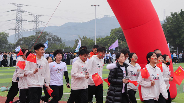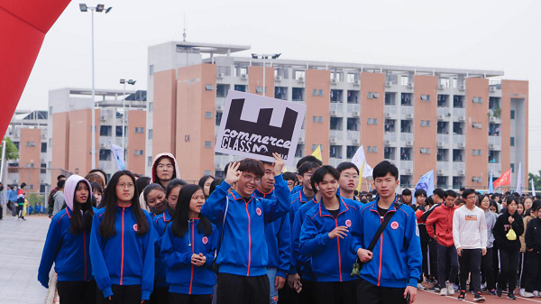 伴随着激昂的音乐,以及助威团的加油鼓励声。教工开始从运动场出发,由运动场西侧校道、经教学楼到达行政楼广场。紧接着出发的是学生方阵。