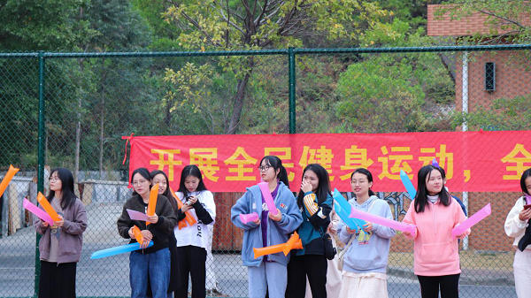 在环湖跑的路线上,由我校瑜伽、足球、篮球、排球、乒乓球、羽毛球、毽球等17个体育单项协会组成的助威团加油鼓励。助威团的同学们拍打着手中的气球棒,乒乓球拍,为经过的教工和同学一遍遍地喊加油。他们在站路边,伸出他们的手,与教工和同学击掌。沿路上欢呼声,加油呐喊声不断,在这个冬日的午后,整个活动路线都变得温暖起来。