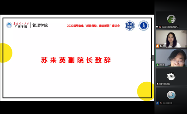 会议伊始,苏来英对本次参加座谈会的各位老师和毕业生代表表示感谢和欢迎,并对受到表彰的同学送上最诚挚的祝贺。她说道,这次疫情让今年的毕业季特殊而难忘,感谢每位同学在这个特殊时期对学院毕业工作配合与支持,同时希望各毕业生在毕业之后也要保持对学习的热情,不断提高自身素质,丰富自己专业知识,充分利用校友会这平台与母校保持联系,关心、关注母校,为母校发展建言献策。