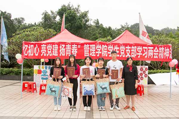 本网讯 (记者 李金苑 饶云)风雨无阻学习之路,为了提高学生党员和入党积极分子对两会精神的理解领悟,进一步提高思想觉悟和党性修养,加强党组织的凝聚力。4月18日下午,管理学院党总支在学生活动中心广场开展了以“忆初心、亮党建、扬青春”为主题的学习两会精神”游园会。管理学院党总支书记、副院长苏来英、管理学院党总支、党务办公室相关负责人和师生代表参加了本次活动。