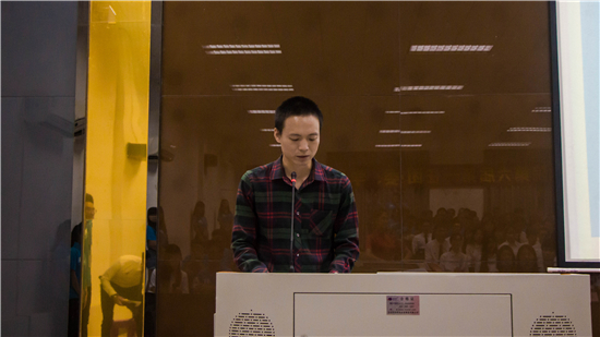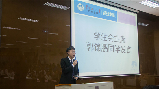 随后,学生会郭锦鹏同学上台发言,他指出在接下来的一年里,要加强学生干部、干事的思想素质,提高工作效率,推进实务培训和素质拓展的相互结合,同时期望新一届的成员能不忘初心,继续向前。