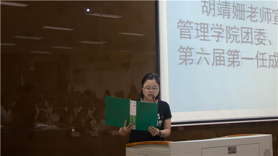 大会议程第五项由团委副书记胡靖姗宣读《管理学院团委、学生会第六届第一任委员任命名单》。最后,全体起立奏唱《共产主义青年团团歌》。