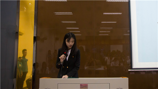 大会议程第四项由团委副书记黄路路同学上台发言,她点明了管院团学的工作理念,总结了过去一年的工作,并相信在学校及学院各级领导的支持下,团学会进一步高举“管院精灵,蓝心为你”的大旗,创造新的辉煌。