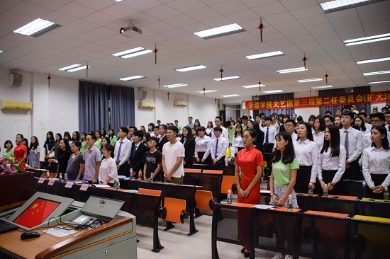 大会接近尾声,由新一任团长陈树卓带领管理学院文艺团第四届第一任文艺团委员宣誓:在未来的一年里,我们将不忘初心,用认真负责的态度将文艺团带向更高的台阶。最后,全体起立奏唱《共青主义青年团团歌》,华南理工大学广州学院管理学院文艺团第三届第二任委员会(扩大)会议在团歌中完满落幕。