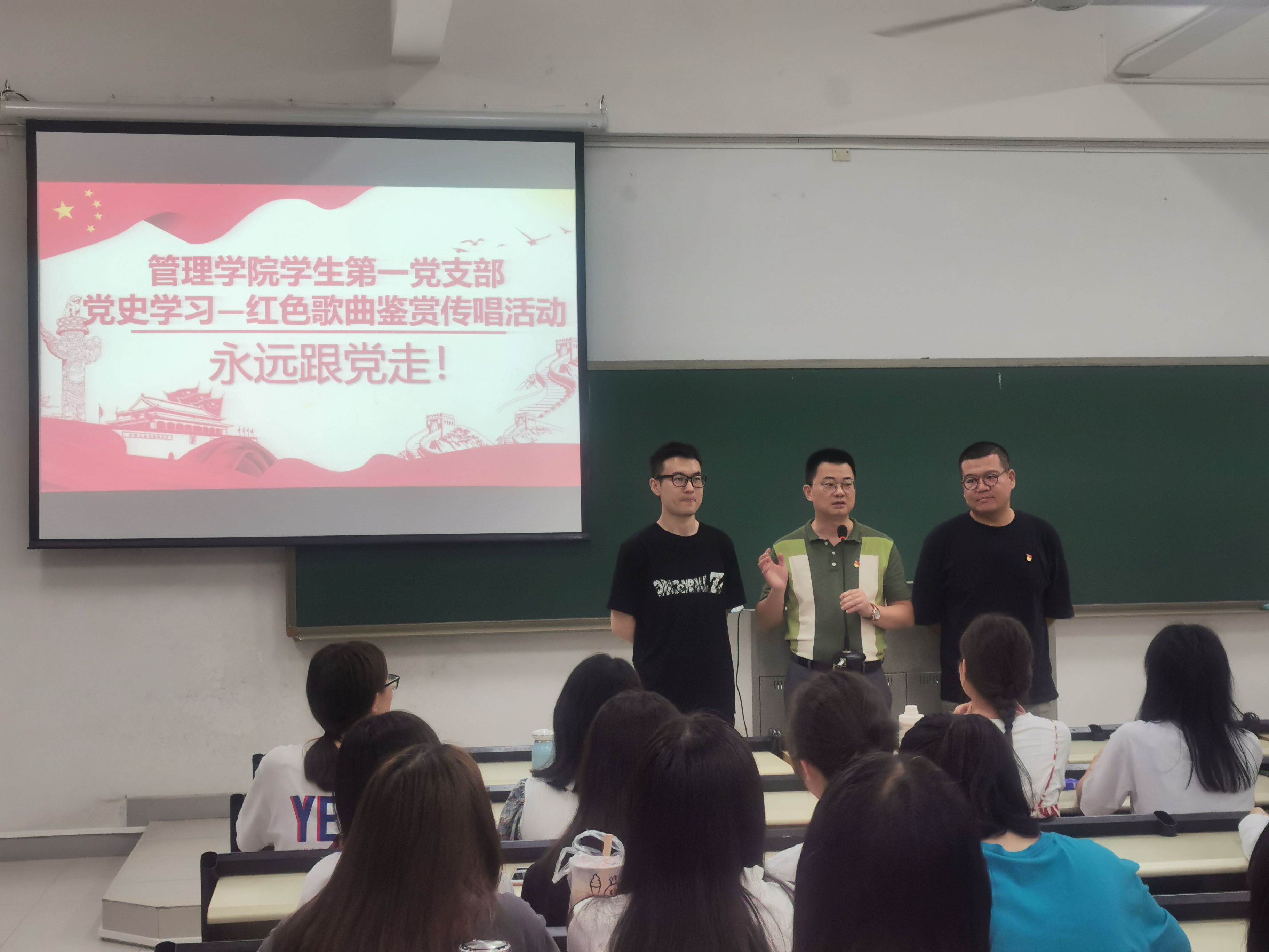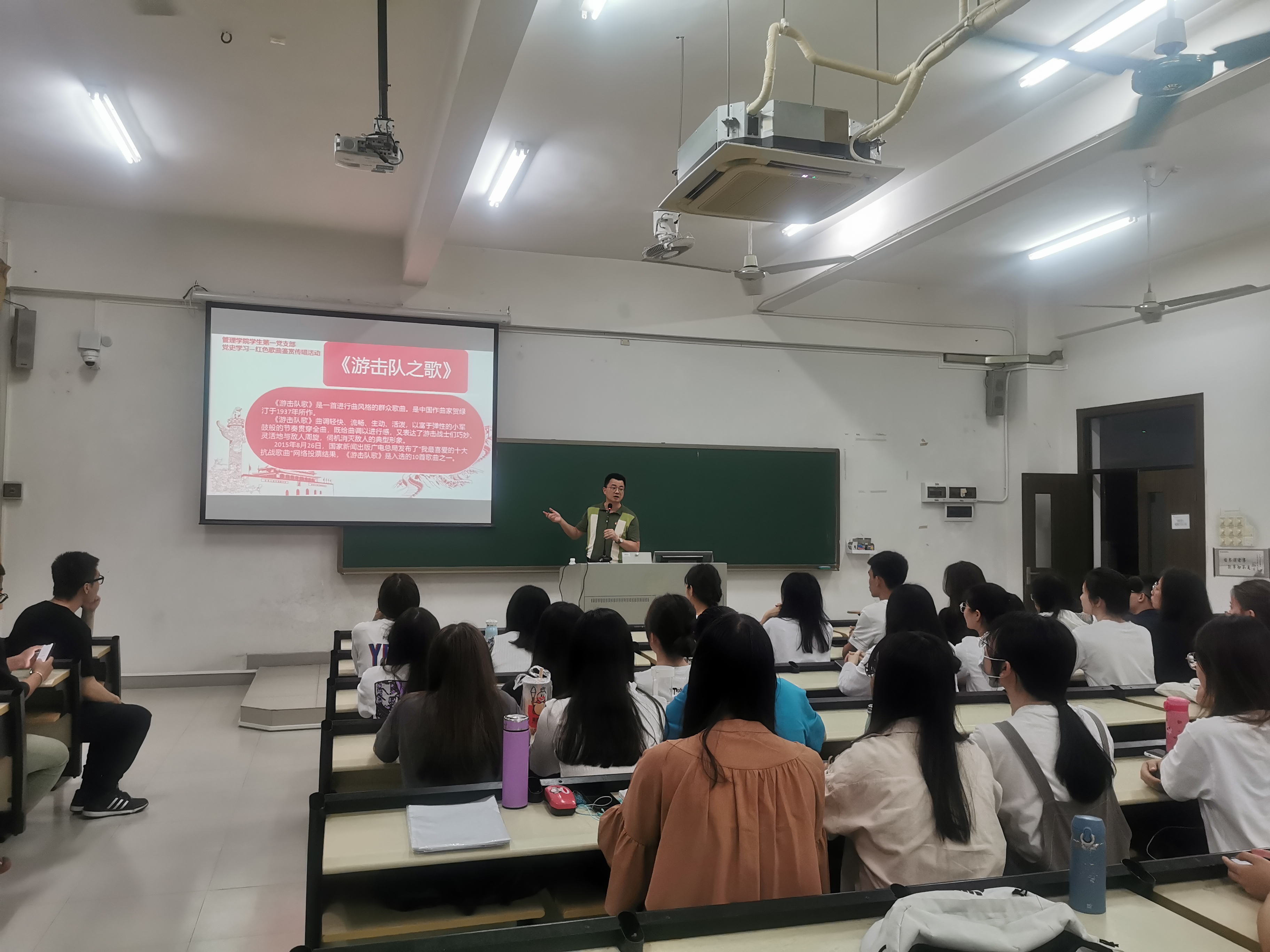 2021年4月13日晚,管理学院学生第一党支部在A1-205组织举行“永远跟党走” 红色歌曲鉴赏传唱活动。管理学院党总支部委员、学生工作办公室副主任戴杰给与会师生党员做了《游击队歌》歌曲鉴赏讲解。