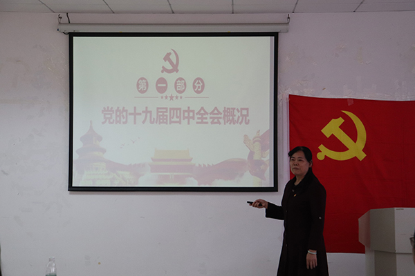 尔后,在学习党的十九届四中全会内容重点解读时,苏来英强调,党的十八大以来,在共产党领导下,中国特色社会主义制度更加完善、国家治理体系和治理能力现代化水平明显提高,为政治稳定、经济发展、文化繁荣、民族团结、人民幸福、社会安宁、国家统一提供了有力保障。她表示,“我们要切实强化制度意识,加强制度宣传教育,引导在校党员、学子充分认识中国特色社会主义制度的本质特征和优越性,坚定制度自信。”最后,她还指出,坚持和完善中国特色社会主义制度、推进国家治理体系和治理能力现在化,是全党的一项重大战略任务。