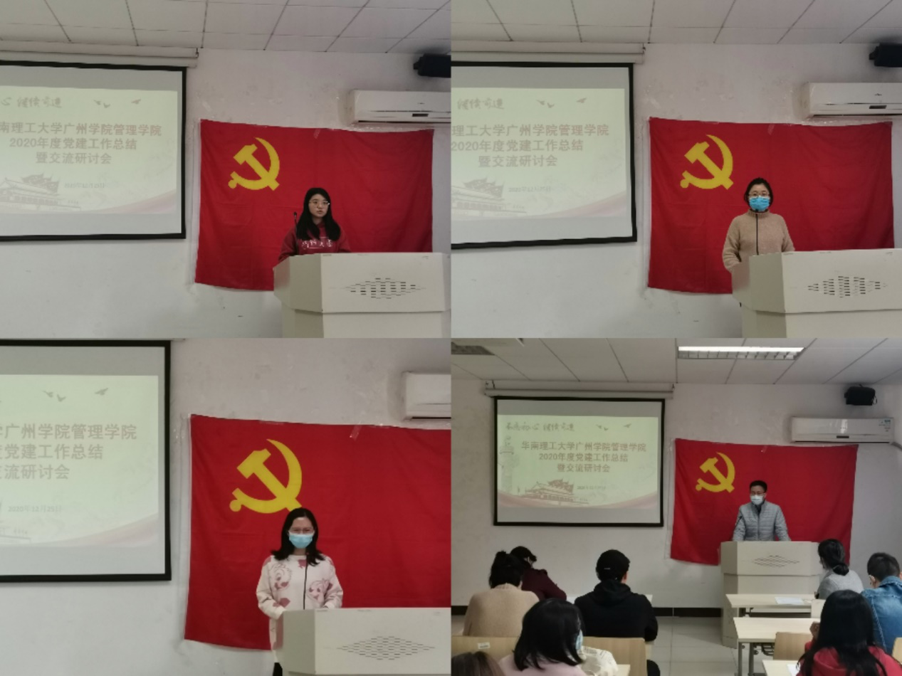 会议上,各党支部书记分别作党建工作交流报告,围绕今年的工作内容,从党建工作形式、成效、存在的问题及改进措施等方面进行了总结汇报,并就明年的工作谈了自己的设想。其中,教工党支部书记们介绍了今年党员发展情况以及这一年来开展的党建活动,分享了自己所在支部是如何进行党员考核和加强党员日常管理的,同时表示把课程思政融入到党建工作中,做好教书育人工作。而学生党支部书记们从党支部人员构成情况、组织建设、党建活动以及学习情况等方面进行汇报,介绍了疫情期间党员同志捐款捐物和做志愿者的先进事迹,并就党支部目前存在的情况进行了剖析,确定了今后改进和努力的方向。