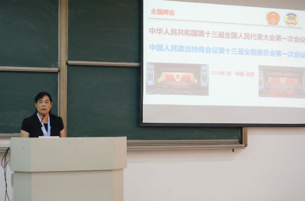 本网讯(记者 夏嘉琪 周智伟)“同学们知道全国‘两会’是指哪两个会议吗?”“2018年全国‘两会’召开时间是什么时候?”“‘两会’有什么历史?”课堂上,管理学院党总支书记苏来英频频走下讲台,与现场的学生互动。这一幕发生在5月18日的一次普通思政课上,苏来英以“奋进新时代、筑梦新征程”为题,为一百多名学子解读全国“两会”精神,其轻松愉悦的授课风格也让课堂变得有趣。