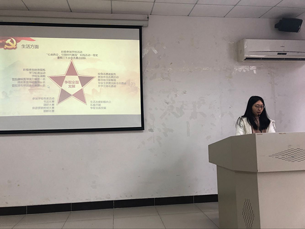 大会第二项,竞选优秀学生党员的六位同志依次上台作个人总结,汇报内容包括思想建设、组织观念、工作作风、学习成绩等方面近两年来的学习与发展,并宣言作为学生党员要坚信信念与信仰,坚持理念与追求,明确责任,发挥党员的先锋模范作用。其中,叶晓美同志结合ppt从多个方面向大家介绍了自己的情况,她曾任管理学院党务办公室学生副主任、秘书长、班级团干,连续三年获得“三好学生”称号,积极参加以党建为主,文体艺术为辅的各项校内外活动,2017年暑期担任了广药集团和黄中药有限公司文宣政工部党务实习生。林柳纯同志汇报到她学习成绩绩点为3.8,同时辅修第二专业,积极参加党支部活动,参与党支部活动组织策划小组,积极调动支部成员参加,其中“不忘初心,牢记使命,共筑中国梦”主题游园会以及“关注两会,我与祖国共奋进”素拓活动均获得二等奖。各位同志汇报后,支部全体党员进行民主互评。