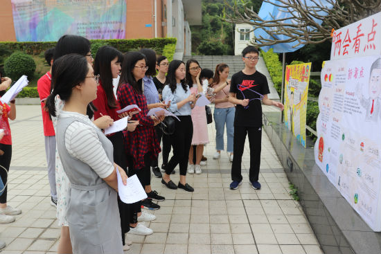 “两会小知识”游戏现场,工作人员对每组开头第一人说一段关于两会的话,由第一人依次传递下去,最后一人报出结果,要求答对十五字以上为过关。这个游戏考的就是同学们的记忆力以及对两会知识的了解。在现场看来,有不少党支部的同学们轻轻松松地就过关了呀!
