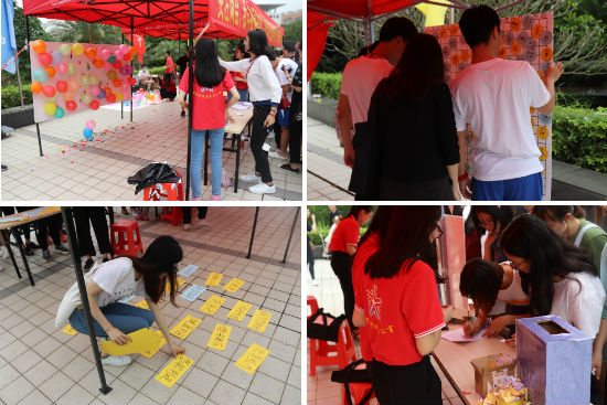 “百发百中”要求同学们用飞镖扎破藏有关于两会内容题目的气球的声音。一些气球里面除了藏有题目,还有抽奖卡。不少同学都扎破了藏有抽奖卡的气球了。答对题目还有额外的奖励!