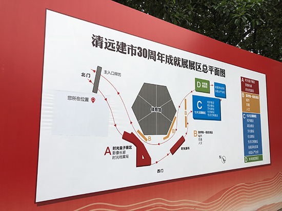 成就展围绕“五位一体”总体布局和“四个全面”战略布局,按“1+8”的结构进行布展,共有经济建设、政治建设、文化建设、社会建设、生态文明建设、全面深化改革、全面从严治党、未来展望等8个展区,以图片、文字、视频、实物、模型、互动体验等多种展示手段和元素,展现了清远建市30年来在各方面的发展历程和成就,及对未来的展望。