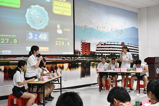 比赛紧接着进入白热化阶段,到达最精彩的环节——自由辩论。正反双方你一言我一句,将自己最犀利的观点活灵活现地表达出来。正方以学生18岁结婚,合权合法,大学生即使在校就读也能够婚育的观点驳斥了反方提出来的学业与婚育相矛盾的问题;而反方则是用生育子女的数量不变的原理反驳了正方的人口老龄化问题,双方打得难舍难分,不相上下。短暂休息后,正反双方分别进行总结陈词,两队再次将己方观点有条有理地展现在评委和观众面前,评委和观众也针对自己的疑问向正反两方的观点提出问题,台上台下的互动,让现场气氛更加热烈。