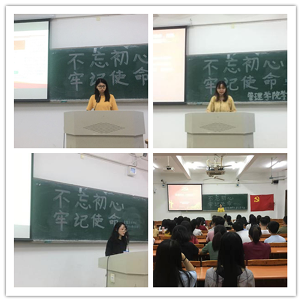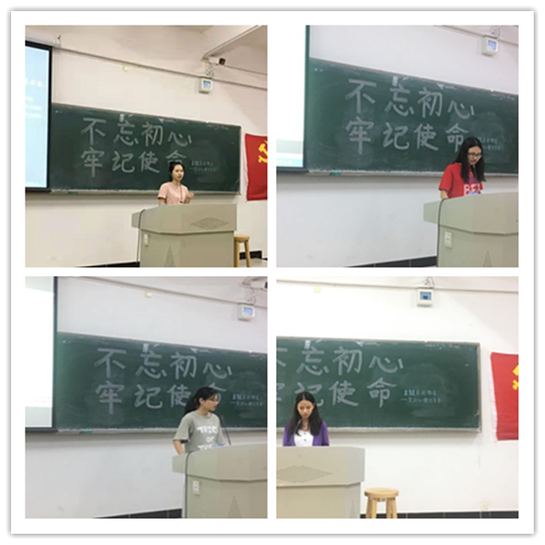 本次分享会的第一个环节,由学生第三党支部党员蓝晓晴同志主持发言,并首先进行了她对学习《习近平关于“不忘初心,牢记使命”的论述摘要》的心得感悟分享。她强调同志们不忘初心,要坚守自己入党的初心,充分调动积极性,为党支部奉献出自己的一份力量,要从服务支部开始。