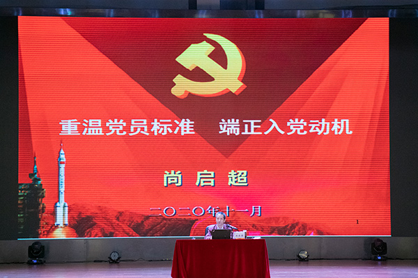 讲座中,尚启超以“重温党员标准,端正入党动机”为主题进行讲解。首先,他带领现场师生一同回顾了一些我国历史上重大事件,回顾辉煌历程,铭记历史功绩,同时结合时事,例如“嫦娥五号的发射”、“美国对我国的打压”,强调现在的竞争更多的是科技上的,并告诫在座的学员应勿忘国耻,坚持中国特色社会主义文化自信。