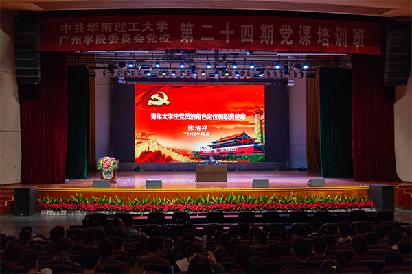 本网讯(记者 唐卫聪 卢镟宇)11月29日晚19:00,华南理工大学广州学院第二十四期党课培训班在学生活动中心正式开班,开始为期一个月的入党培训。本次党课班的第一课由学校党委书记张培祥主讲,共有 540 人到场,其中包括533名学生7名老师。