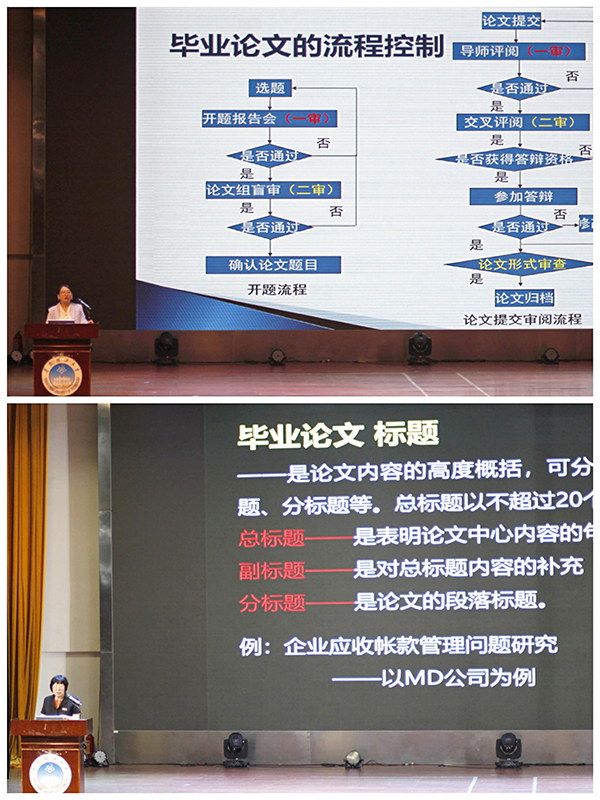 紧接着,刘飞燕副院长做主题为“毕业论文和实习安排”的专题报告。她从社会实习、毕业论文以及理论学习等方面阐释说明。刘飞燕指出实习是大四学业中非常重要的一个环节,对毕业后就业很莫大的帮助。在毕业论文方面,刘飞燕提出要遵守规则,提高时间利用率,希望同学们能够谨记“提前启动即主动”,为自己的未来提前打开一扇窗。
