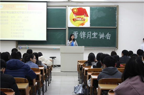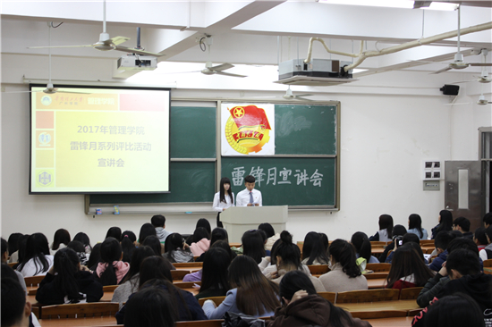 为积极响应省团委的号召,激发基层组织活力,加强雷锋精神对基层组织的思想引领建设作用。对此,管理学院团委、学生会青年志愿者服务部开展了以四个全面相照应的“四用”精神作为主题,以用文字、用镜头、用书画、用行动诠释雷锋精神为主旨,以燃青春之火,铸志愿之魂为口号的学雷锋志愿服务月系列评比活动。同时,为提升活动的质量与水平,激发基层团组织参与力,管理学院团委、学生会青年志愿服务部于3月7日晚上七点在A5-112召开了本次2017年学雷锋志愿服务月系列评比活动宣讲会。参加本次宣讲会的有来自管理学院的团委副书记梁丹妮同学与郑炜枫同学、来自2014级、2015级、2016级的团干代表以及管理学院团委、学生会青年志愿者服务部的全体成员。