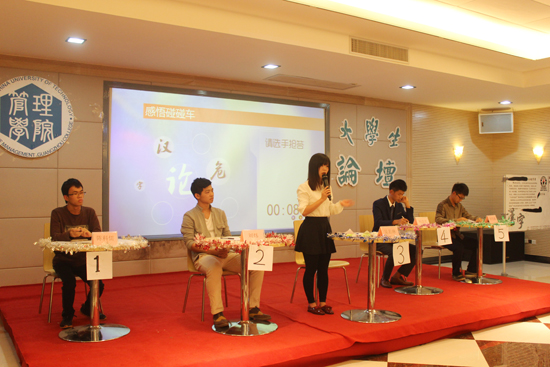 随后是本次大学生论坛最精彩的环节——“感悟碰碰车”。选手们互相提问,彼此针锋相对却又不失风采仪态的言语,更是让现场观众掌声连连,赞叹不已。4号选手杨浩东保持中立的立场,他认为在推动汉字适应现代信息化发展的同时也要注重汉字的内涵与历史,而5号选手周竻盛却认为随着外来思想入侵和国人对本国传统的忽视,思维已经定格,察觉不出汉字正处于一个多么危险的位置。5位选手立足于自己的观点,从不同的角度不同的理念去完善自己的观点以及提出对对方观点的疑问,思想的交流,观点的碰撞,也使活动愈加精彩。在“感悟碰碰车”环节结束后,杨兆文老师分别对五位选手进行点评,给予了选手们充分的肯定,同时也提出了不足。