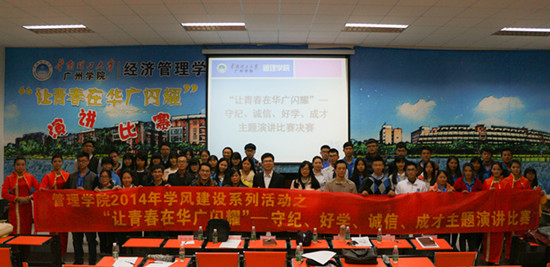 本网讯 为加强学风建设,营造华广“守纪、好学、诚信、成才”的良好学风氛围,积极发挥学生在学风建设中的主体地位,12月4日晚,管理学院在A8-101举行了 “让青春在华广闪耀”主题演讲比赛决赛。管理学院党总支书记、副院长苏来英等出席了比赛。