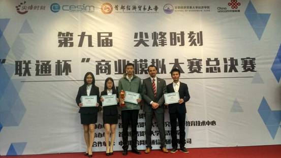 本网讯(记者官伟龙)3月17日至19日,第九届尖烽时刻“联通杯”全国商业模拟大赛中国区总决赛在北京首都经济贸易大学举行,我校邝永豪、陈锦隆、黎倩倩、林婉春四名学生组成的ERP沙盘协会队伍在管理学院的老师官伟龙带领下历经初赛、复赛的重重选拔,进入了中国区总决赛,在决赛中与中国人民大学、浙江财经大学、暨南大学、首都经济贸易大学、华南理工大学、南开大学、北京邮电大学等32所著名高校的43支队伍(包括本科生组和MBA组)激烈角逐,最终荣获全国二等奖,官伟龙老师也荣获优秀指导老师奖。