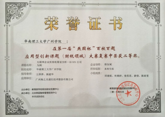 本网讯(记者徐思思、王萍萍)6月1日至6月3日,第一届“燕园杯”百校百题应用型创新课题(财税领域)大赛复赛(B区)在广东工业大学举行。我校代表团队由管理学院王萍萍、姚建华两位老师带领2014级会计专业陈丽斐、杜婉婷、徐思思、游倩、邱德妮5名同学参赛,经过大赛的激烈角逐,喜获第一届“燕园杯”百校百题应用型创新课题(财税领域)大赛复赛二等奖。