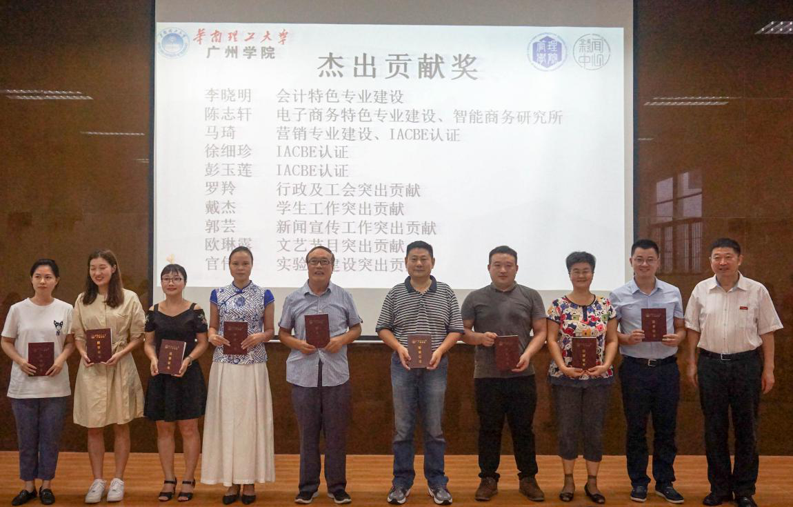刘志超向李晓明、陈志轩、马琦等十位教师,颁发管理学院2018-2019年度“杰出贡献奖”荣誉证书。