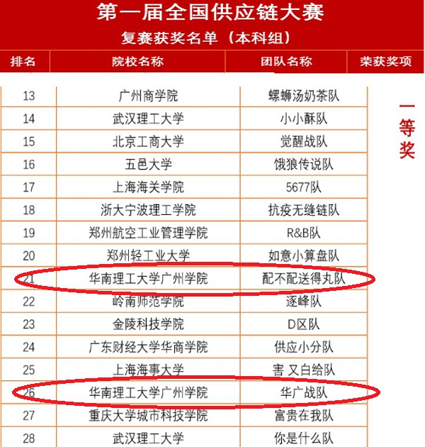 本网讯(记者余琳姗应澎)4月28日,由中国物流与采购联合会主办的、面向全国本科、高职和技师院校在校生的大型供应链竞赛活动——第一届全国供应链大赛复赛获奖名单公布,我校工商管理专业物流与供应链方向8位同学组成的两支队伍“华广战队”和“配不配送得丸队”在众多队伍中脱颖而出,均荣获一等奖的好成绩。此次大赛本科组共有549支队伍参与,其中包括华南理工大学、同济大学、华中科技大学、四川大学等国内知名大学。