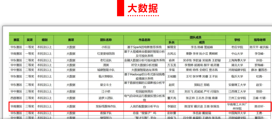 本网讯(记者郭芸) 5月13日,历时9个月的全国大学生“互联网+”创新大赛暨第五届“发现杯”全国大学生互联网软件设计大奖赛区域赛落下帷幕,华南理工大学广州学院参赛团队的“人岗匹配数据分析平台”作品荣获大数据华南赛区三等奖。本次参赛团队由队长李颖欣和队员陈泽军、赖汉逵、王微、张锦浩组成,在陈志轩老师的指导和全体队员的共同努力下,选择了最具有挑战性的大数据赛道,创造性地开发了“人岗匹配数据分析平台”作品,与中山大学、武汉大学等985、211院校的参赛团队同台竞技,最终取得佳绩。