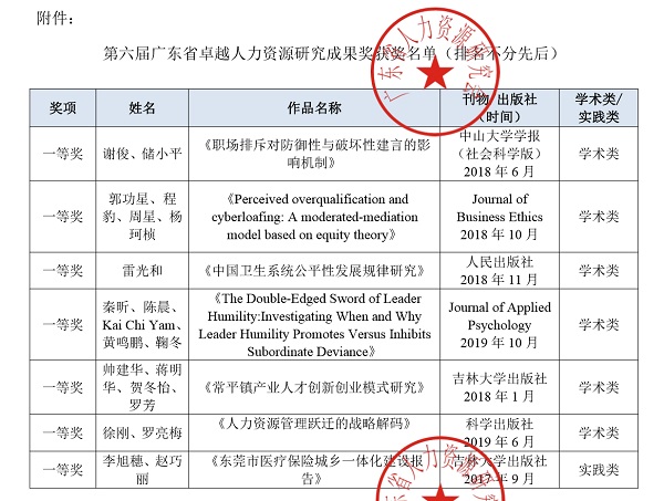 广东省卓越人力资源研究成果奖是由广东省人力资源研究会主办设立,奖项分为学术奖、实践类两大类。经过专家通讯评审推荐与学术委员会审核批准,此次共有25份参选作品获得第六届广东省卓越人力资源研究成果奖殊荣。其中,由我校李旭穗、赵巧丽教师主编的《东莞市医疗保险城乡一体化建设报告》获得了成果奖(实践类)一等奖。