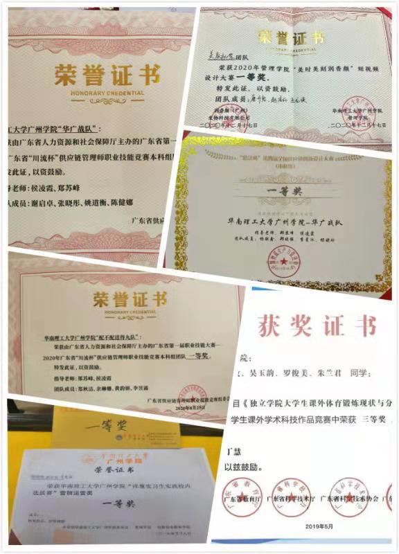 2017 | 第一届全国供应链大赛复赛“一等奖”、决赛“铜奖”,第一届全国供应链大赛银奖,2020年第三届全国大学生计算机技能应用大赛二等奖,2020年全国职业发展大赛二等奖;“学创杯”2020全国大学生创业综合模拟大赛二等奖/2020年广东省“川流杯”供应链管理师职业技能竞赛“一等奖”;2018年广东省大学生田径锦标赛4*400m第二名;2020年全国高校商业精英挑战赛国际贸易竞赛“铂元杯”广东省省赛三等奖;.广东省OMG实习生计划暨2018年广州大学生创新创业实训项目金牌挑战赛专业组一等奖;广东省第十届大学生排球联赛女子甲b组第五名;第十二届挑战杯大学生创业大赛省赛铜奖;2019年川流杯供应链大赛三等奖;2020年川流杯供应链大赛二等奖;全国大学生英语竞赛省级二等奖 |