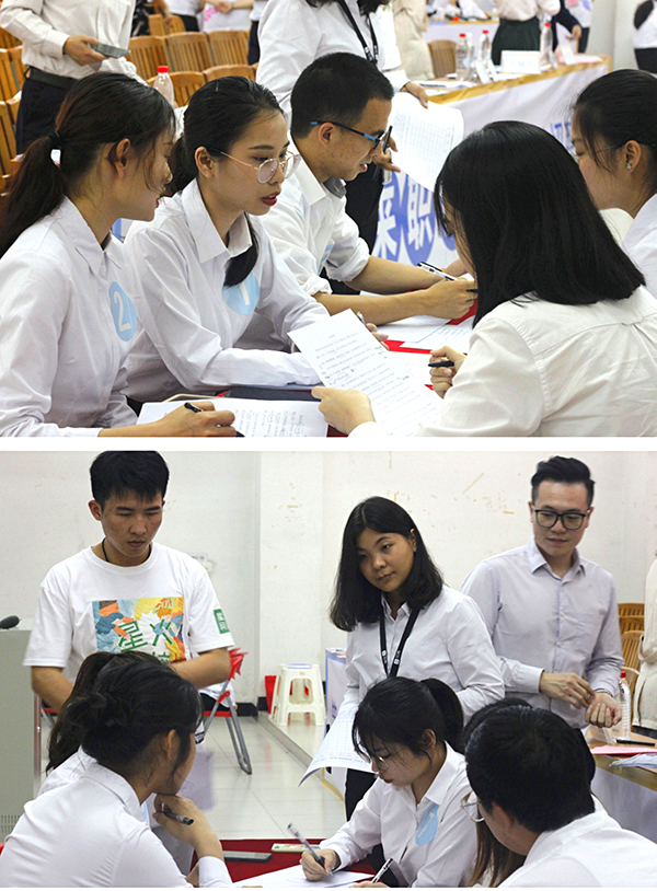 比赛过程中,10名选手依次登场,通过PPT自我求职展示,提供求职意向,积极向用人单位表达就业的意愿和能力。评委根据选手现场表现和自制简历打分,就求职理由、职业规划等内容,对选手的职业素养、应变能力和表达能力等方面进全面的考察和点评。接下来的无领导小组讨论环节中,两组经过各自组内讨论,在给定的题目下阐述自己的观点和发表意见,表明态度,评委们也在认真细心地观察每一位选手的表现。