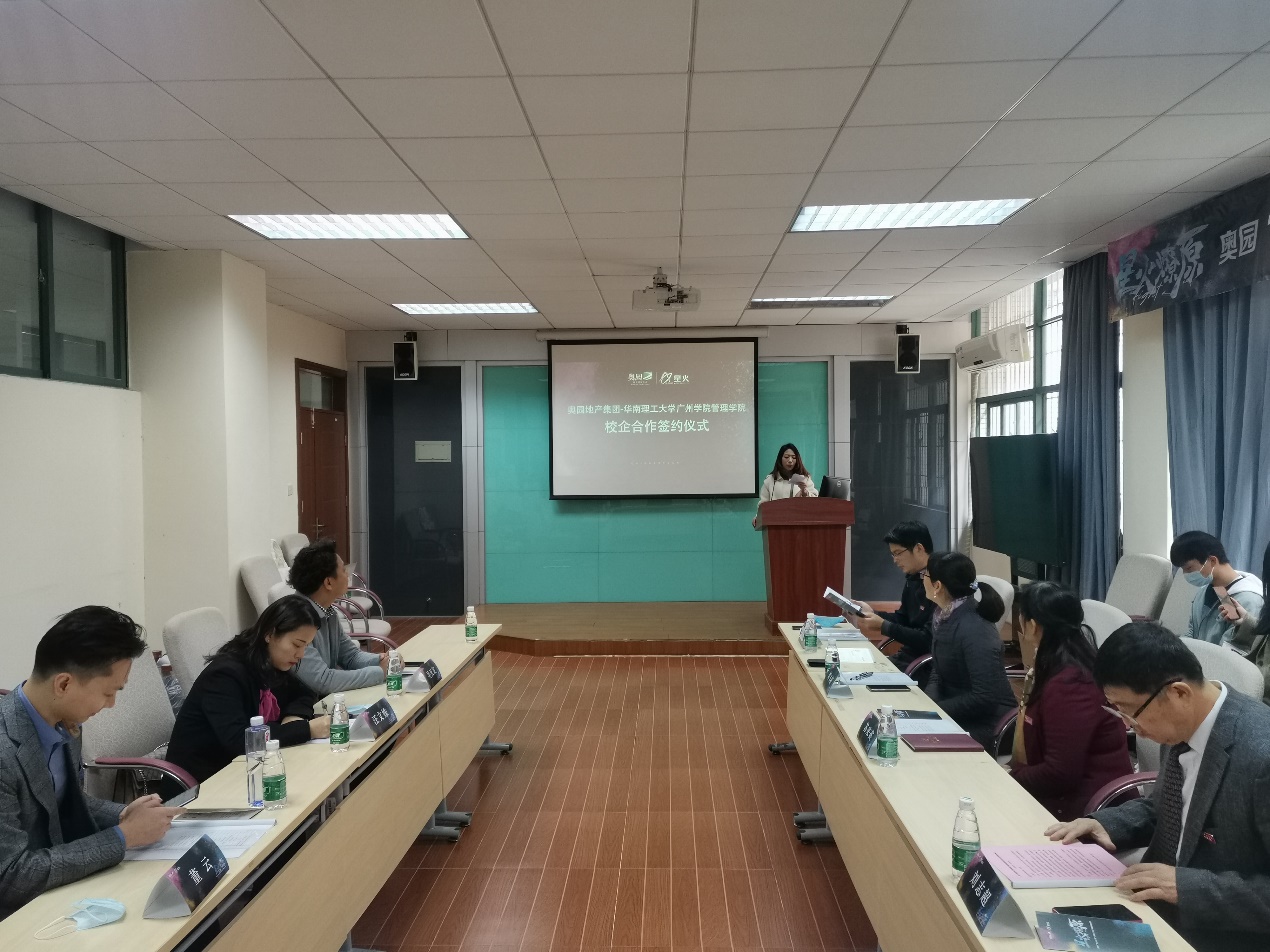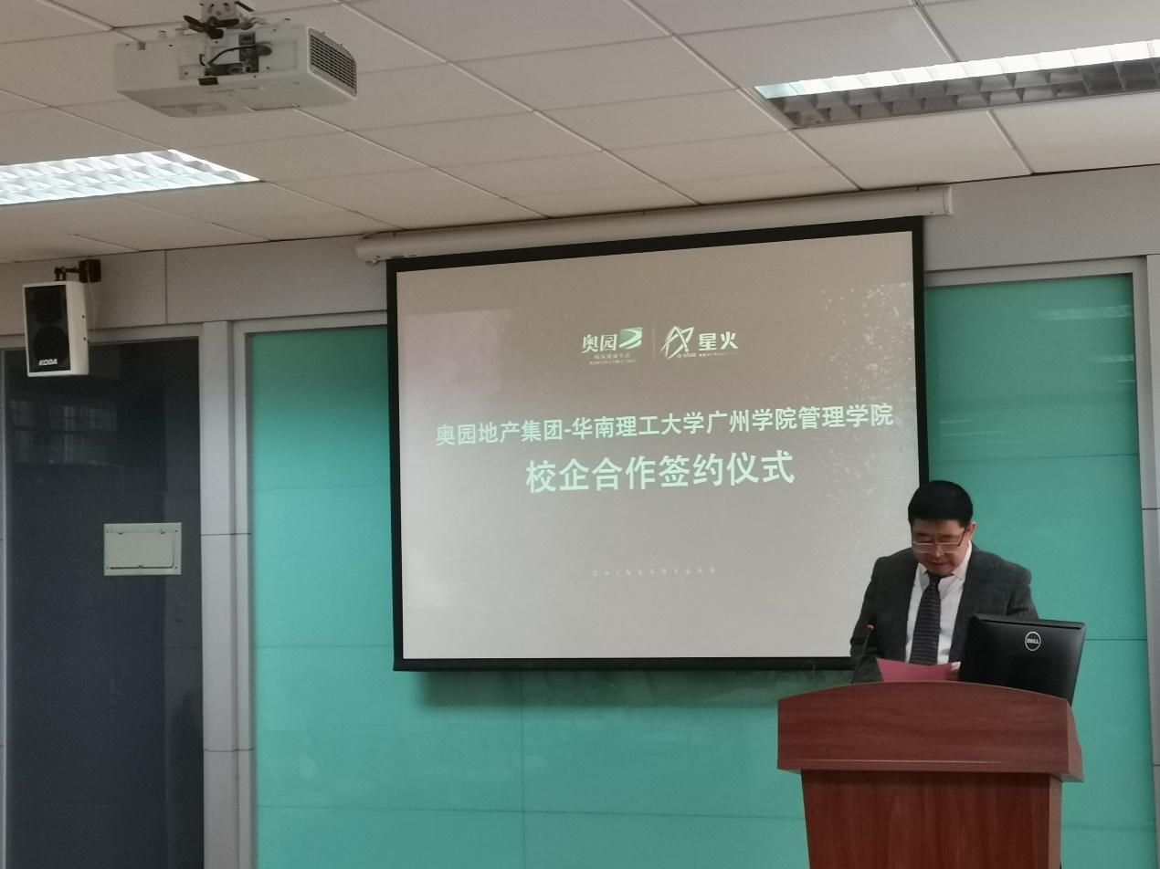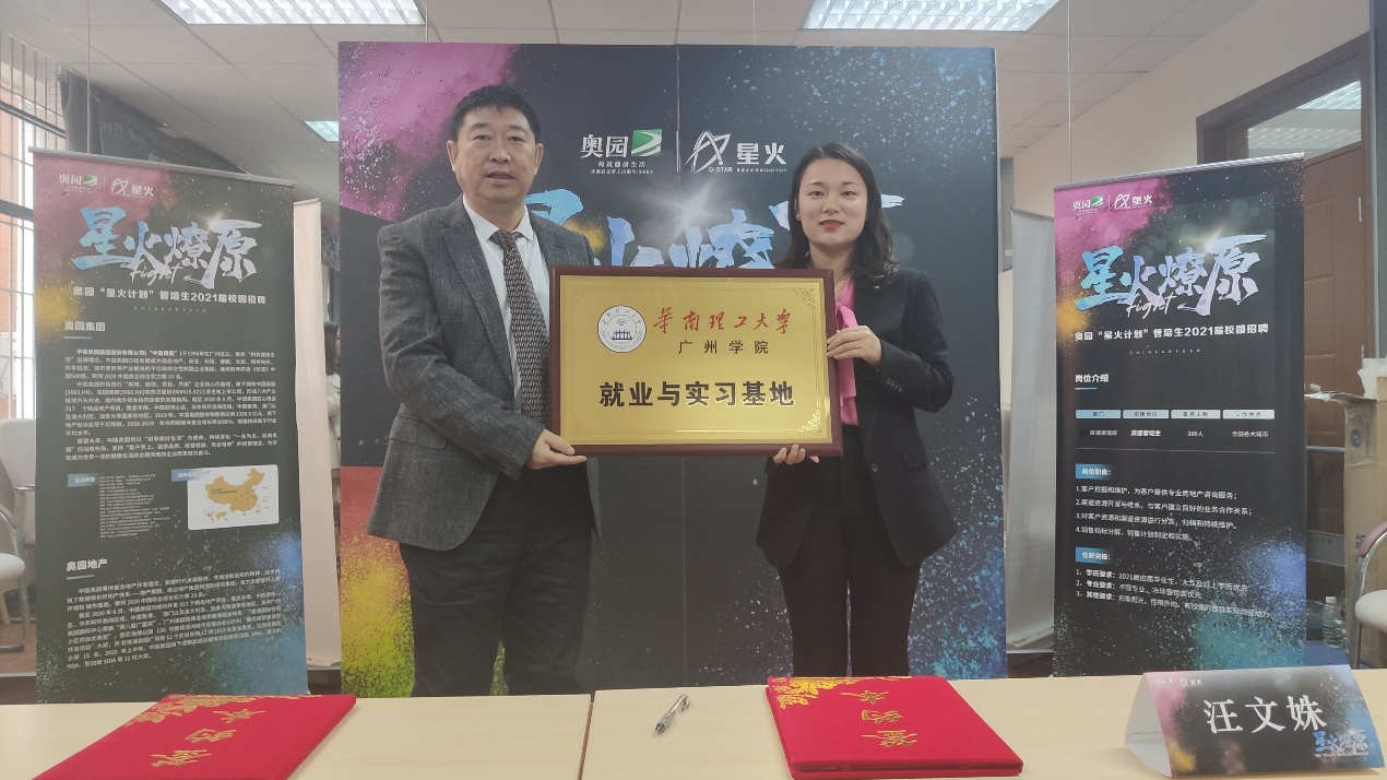 本网讯(记者应澎)12月23日,我校管理学院与奥园地产集团在A9-104举行就业实习基地签约暨挂牌仪式,奥园地产集团广州区域公司营销副总经理汪文姝,渠道总监吴天定,奥园地产集团星火公司总经理、星火计划发起人董云,管理学院暨创新创业教育学院院长刘志超,学院党总支书记、副院长苏来英,副院长刘飞燕,学校就业指导中心相关老师以及相关工作人员参加了本次签约挂牌仪式。