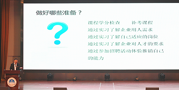 随后,刘志超为毕业生们作毕业就业教育主题报告。刘志超从目前就业形势以及准备工作等方面进行讲解,说道,同学们目前主要任务就是毕业与就业,希望他们做好吃苦耐劳的心理准备,鼓励他们积极争取实习机会和主动参加社会实践,用努力的汗水去灌溉、去滋润属于自己的新天地。同时对即将走出校门的毕业生们,刘志超提出四点建议:要多多总结经验,将理论知识应用于现实生活;要树立良好的形象,充分将自己的能力展现给领导;要善于思考,勤于沟通交流,学会推销自己;要积极主动,不放过一丝机会,尽量寻找到心仪的就业岗位。