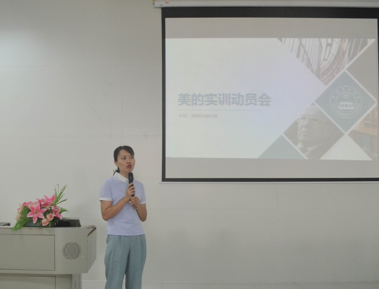 活动伊始,张云侠及与会师生向美的集团的8位老师表示欢迎。会上,张云侠从时间安排、分班情况及注意事项、实训老师简介三个方面做了项目安排介绍,并且介绍了培训期间的筛选标准和本次实训的重要意义。她建议同学们认真对待这次实训,通过实训积累经验,找出自身不足,并在接下来的时间弥补不足之处。