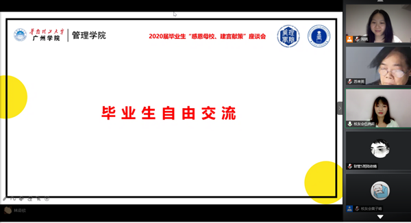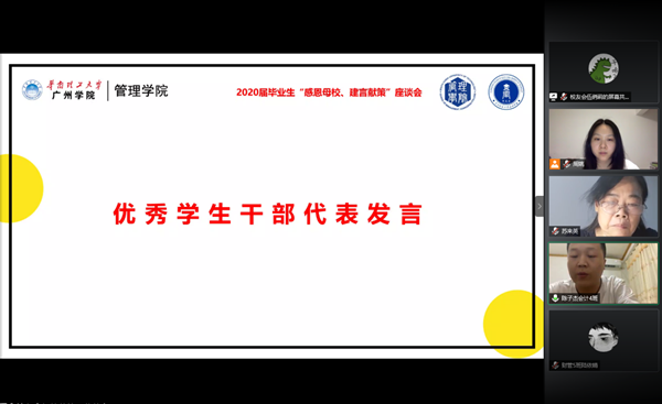 本网讯(记者应澎凌海文)为了更好地开展校友工作,保持毕业生与母校的畅通联系,充分发挥广大校友在学院建设发展中的积极作用。管理学院于6月17日晚利用腾讯会议召开了2020届毕业生“感恩母校、建言献策”座谈会暨“优秀学生干部”表彰大会。管理学院党总支书记、副院长苏来英、相关师生参加此次线上会议。