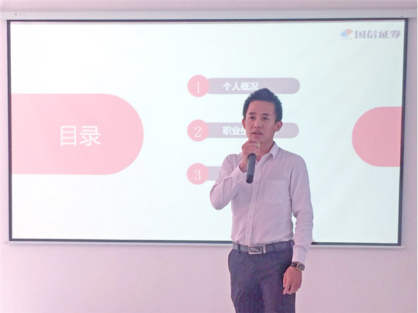 管理学院2018届会计专业毕业生邓邦龙,他任职于国信证券股份有限公司广东金融高新区分公司。在分享中,他从投简历前的准备、简历设计、面试以及上岗后的发展四个方面介绍了就业情况,并重点强调简历设计中应筛选符合所聘职位的个人相关信息以及上岗后对自身的定位,指出每个人应该要有明确的目标和正确的自我定位。他还介绍证券行业的相关形势,拓宽了同学们的就业视野。最后提出“无奋斗,