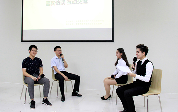 为更好地帮助新生解答疑惑,活动现场进行了嘉宾访谈,主持人针对嘉宾的大学经历以及毕业后的工作经历对嘉宾进行提问。曾梓兵表示:进入企业压力很大,因为工作没有从事自己的专业,所以在工作上会遇到很多困难,但这是一个非常好的提升自我的机会;有必要在大学和同学们一起相互促进,相互学习。冯凌雁则表示:在管理学院篮球队精神——坚持的潜移默化之下,自己在工作上也能够刻苦、坚持,坚持是成功的第一步;在社会实践中应该保持一颗爱心去参加有意义的活动。