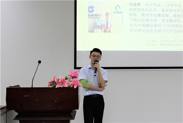 现任职于中国建设银行的优秀员工——2018届毕业生冯凌雁将自己的亲身经历总结为四点分享给新生:身体乃是革命的本钱;做到早睡早起,吃饭要注意营养;学习不可以落下;时刻注意自己的成绩,并做好期末复习。同时他也建议新生,大学期间多参加社团或者组织活动,扩展自己的人脉,锻炼自己的能力。他指出参加校内组织的同时,社会实践活动也必不可少,社会实践活动不仅能见识外面的世界,也能学习到更多的东西。
